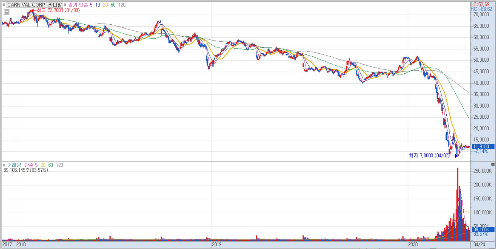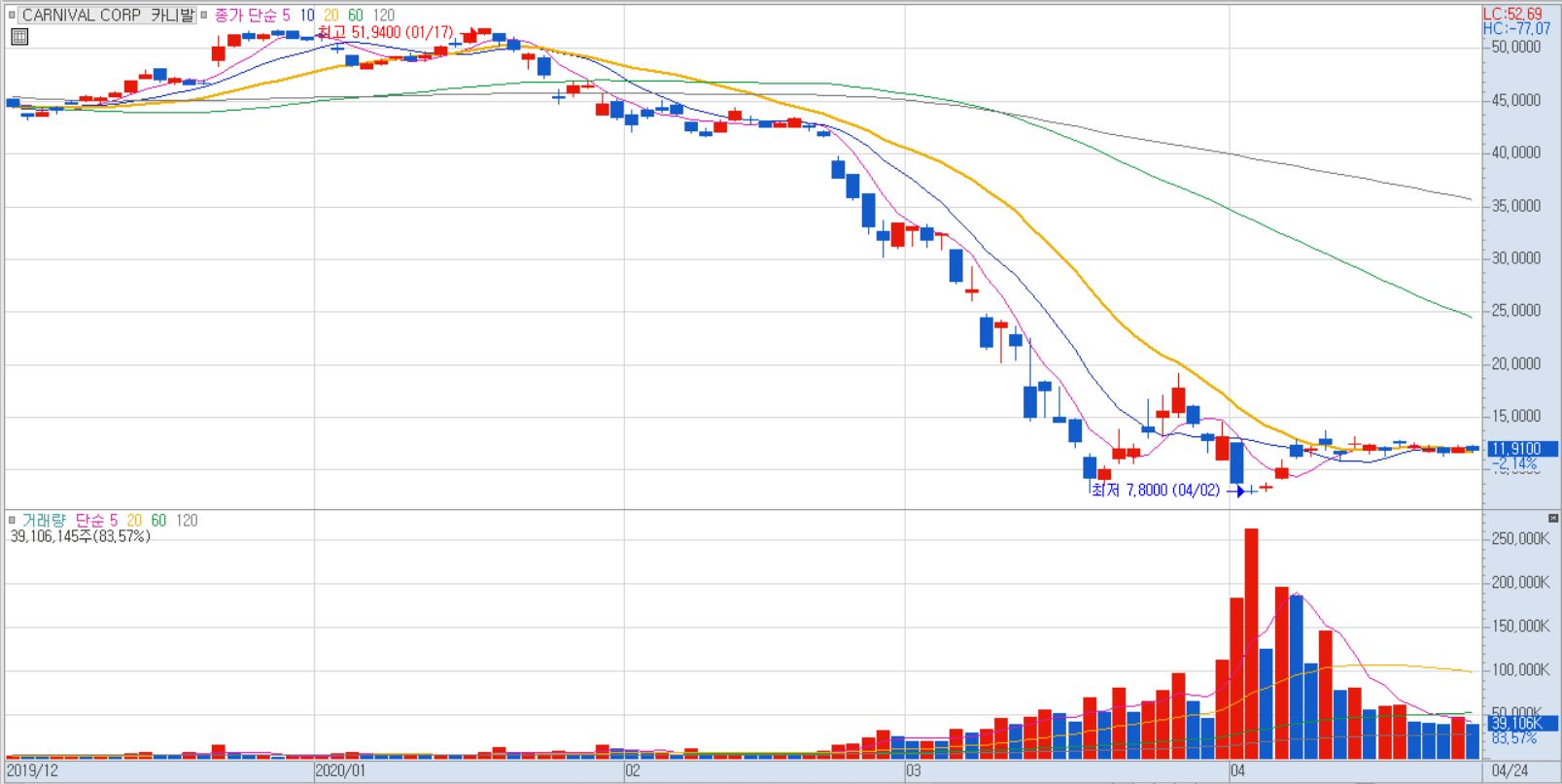 그런 의미에서 차트를 보면 카니발 기업의 재무건정성 악화 및 기업 성장의 한계 국면에서 하락하는 단계에서 코로나19를 맞이했다고 해석할 수 있다. 하지만 계속 흘러 내리던 주가 흐름은 달라진 모습을 보이기도 했는데 2019년 9월 13일 50.87 달러를 넘어선 51.94 달러 (2020년 1월 17일)를 기록한 뒤 미국 및 유럽의 코로나19 확산으로 주가가 폭락했다는 점이다. 코로나19가 예전 바이러스인 사스, 에볼라와 같이 전세계로 확산되지 않고 일부 지역에 국한된 상황에서 종식됐다면 상승 추세를 이어갈 가능성 또한 엿볼 수 있기도 하다.
