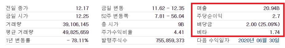 52주 최고가 : 56.04 달러 (2019년 5월 1일) / 52주 최저가 : 7.8 달러 (2020년 4월 2일)