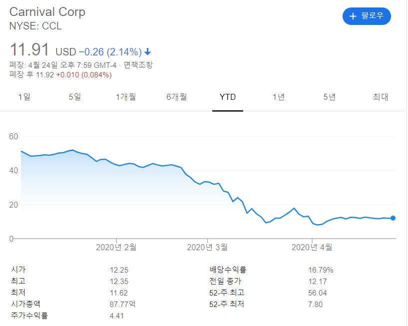 카니발 배당을 보도록 하자. 매년 분기배당을 해왔으며 현재 배당수익률은 16.9%에 이르고 있다. 물론 1분기 무렵 크루즈 여행이 중단됐기 때문에 향후 1년 간은 주주에게 배당을 줄 여력은 없을거라 생각한다.